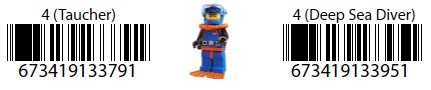 Here the figure and accessories are hard to separate. There are six different pieces overall. There's the helmet with trans-blue goggles and snorkel, head, wetsuit torso, scuba tank, legs, and flippers. Although the colors and print are different, this figure is not unlike those offered with the Aquaraiders back in 2007.As always the figure comes with the new minifigure stand.