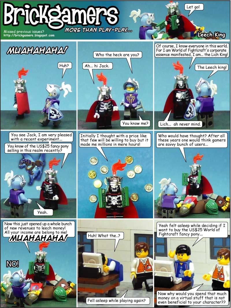 Nevertheless, I've found a brick comic which I've found to be quite good. Brickgamers combines LEGO and video games with a nice and often comedic effect. The issue here comments on developments in the game World of Warcraft to sell a Celestial Steed for around $25 USD. Needless to say it still amazes me what people will spend their money on.