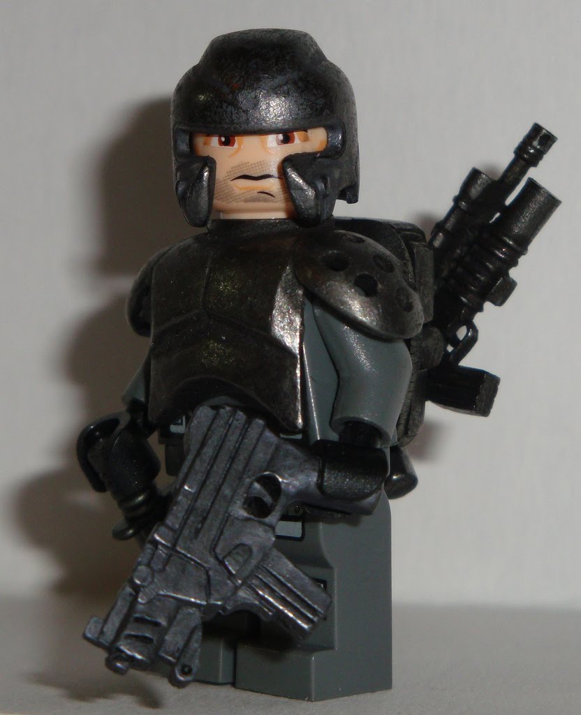 First up is this red armored warrior. The helmet is a modified version of part 85944 from Space Police III. The body armor is from Power Miners (part 85961). The shoulder cannon seems like it would be a custom part, but its actually a Star Wars Super Battle Droid arm (part 64796). The head? A Harry Potter death eater mask. Finally the gun is an Amazing Armory M4A1. So how does Pedro achieve that shiny, candy-like exterior? Mr. Color paint, cranberry red pearl.