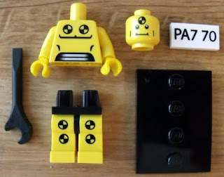 The Demolition Dummy is made of three parts: head, torso, and legs all with crash test print. There are two accessories, likely to make up for the fewer minifigure parts. The first is part 4006, a spanner, and part 3069, a 1x2 printed tile made to look like a license plate. As always, the figure will come with the new minifigure stand.
