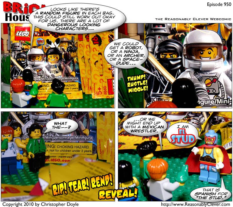 If you haven't been following Christopher Doyle's web comic Brick House recently, you will have missed the recent infusion of Collectible Minifigures into the strip.Chris has recently blogged that he's scored a couple of cases from his local TRU (lucky jerk). I'm really interested to see where this ultimately goes, as I'm hoping he doesn't know which figures are in each of the bags.
