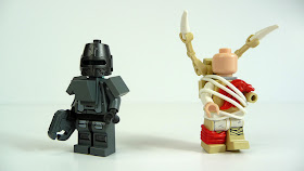 The legs are also a new part. Although they clip onto the torso in a similar fashion as past skeleton figs, there are 'boots' at the bottom resembling a standard minifigure 'foot'. This was likely done to allow the figure to fit into the Ninjago spinner. This will be great for heavily armored deceased custom minifigs.