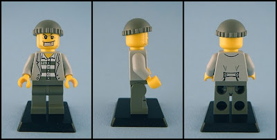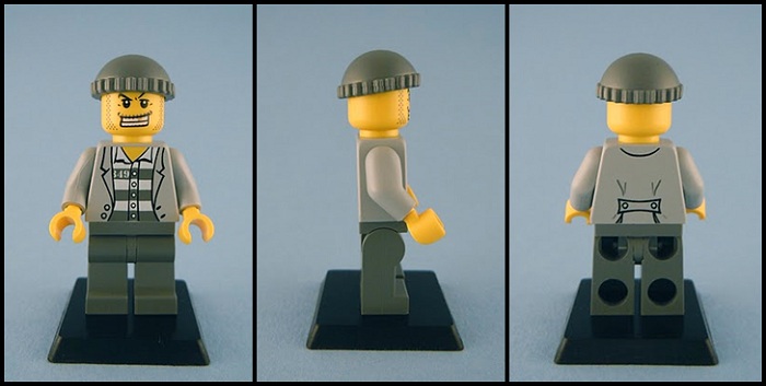 Now that we've covered the 'cops' lets turn our eye to the 'robbers'. The first thief is similar to the police in that most of the elements (hat, head, and legs) have been readily available in other sets of the past. The torso does feature a new print. resembling a light blueish gray jacket over a striped prison shirt. On the back of the torso, the jacket has a cinch.