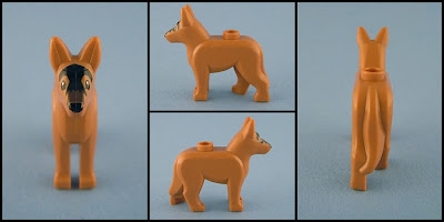 Although not a minifigure, there is a third member of this miniature police force - a german shepard. A new dog mold with a nice facial print, this hound has a footprint (literally) of 2x3 studs. Similar to other dogs of the past, it has a single, open stud on the back. The head is also stationary and does not move.