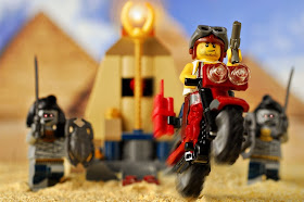 Scrawnysumo demonstrates that even a standard LEGO play set can be transformed into something quite amazing with the right tools. Using the Pharaoh's Quest set Golden Staff Guardians, the 'scrawny one' manages to pull off this great action shot, with evil mummies in pursuit with eyes aglow.